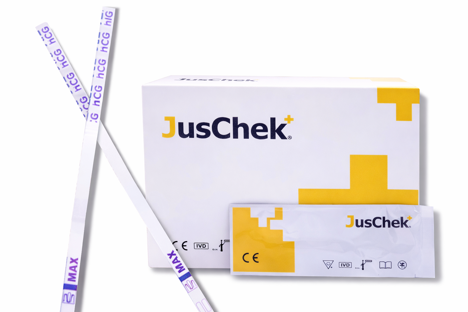 Prueba rápida de embarazo tipo tira, sensibilidad 25 mUI/mL, para la detección cualitativa de hCG en orina. Presentación en caja x 50 unidades.